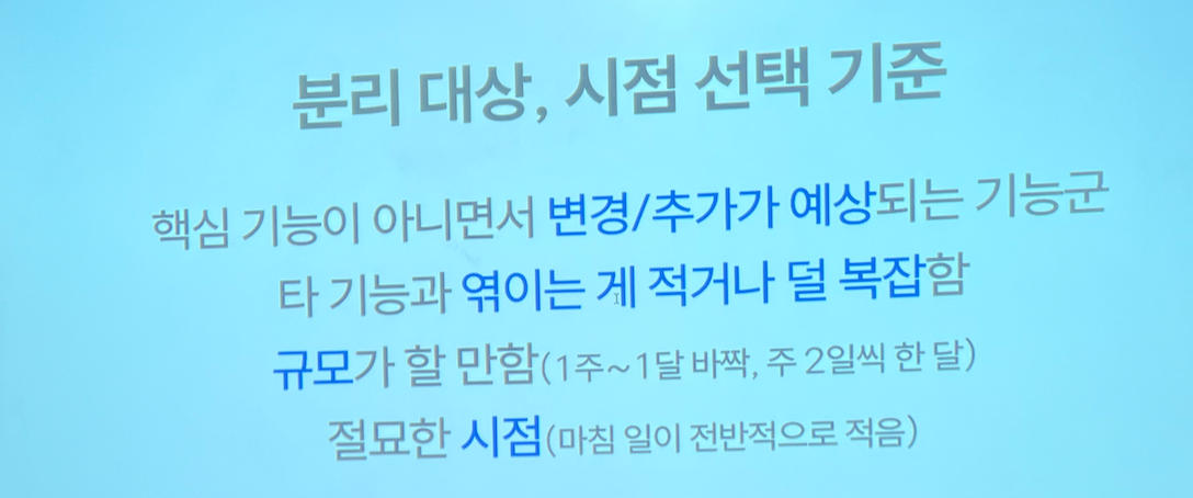이에 따라 결국 서비스 출시 속도가 느려졌고 이때문에 서비스 분리를 결정하게 되었음을 설명해 주셨습니다.