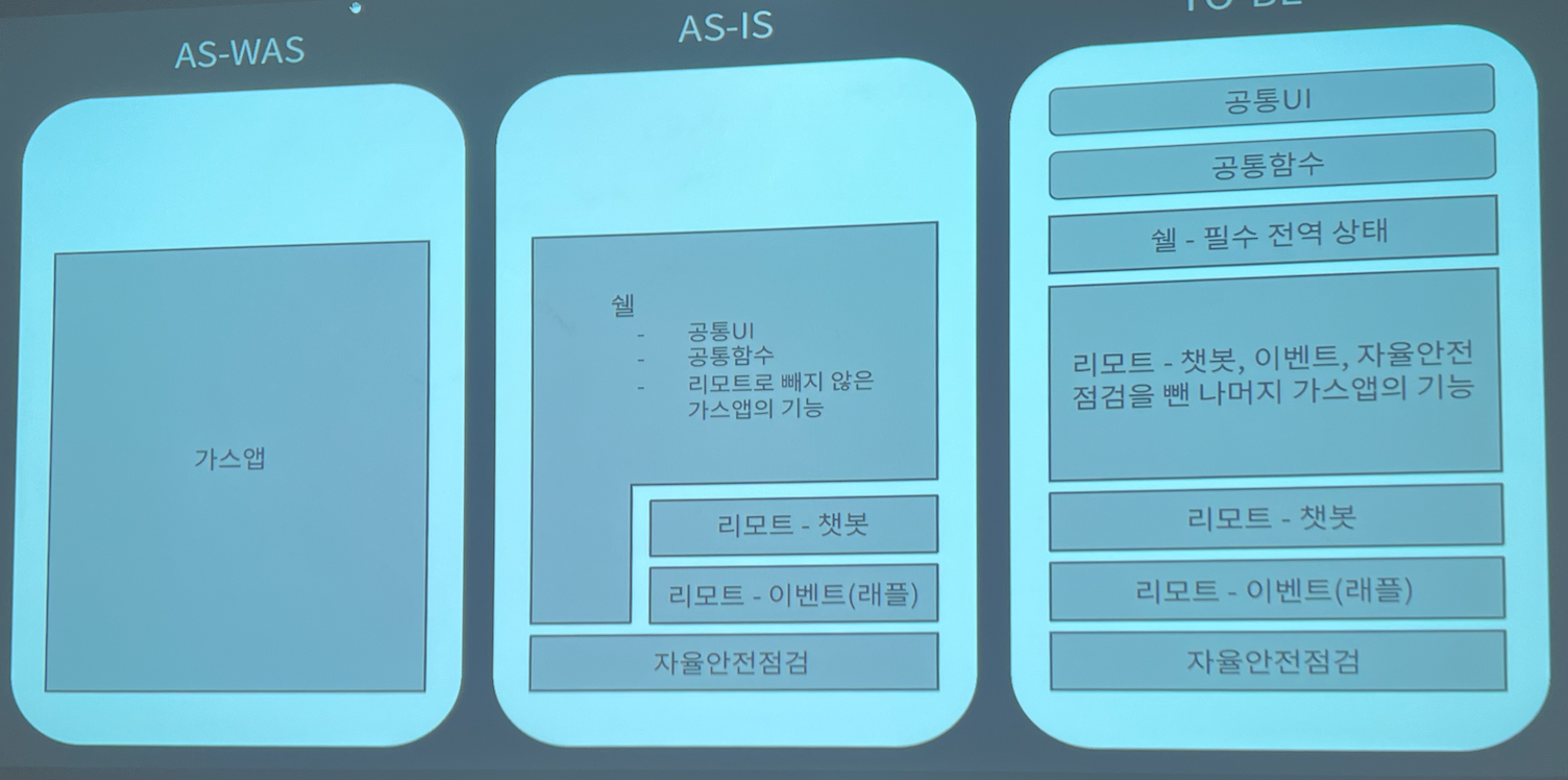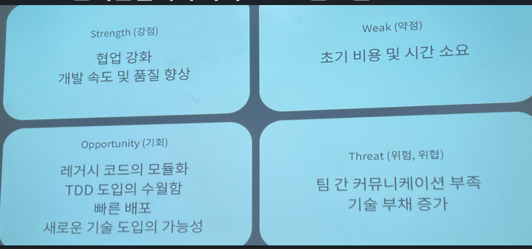 프런트엔드에 Webpack 기술을 정확하게 인지하지는 못해서 상세한 내용은 이해하기 어려웠지만 위의 장표처럼 분리를 진행하였고 인상 깊었던 점은 SWOT 분석을 통해 해당 기술을 적용할 때 어떤 부분을 고려할지에 대해서 정리하고 도입하셨던 점이 인상이 깊었습니다.