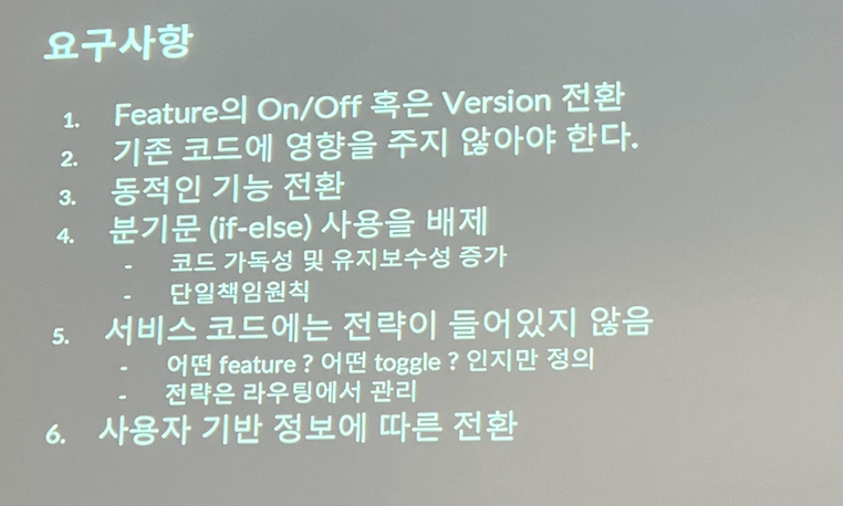 코드를 수정하지 않고 특정분기를 통해 시스템 동작을 바꾸는 개념인 피처토글을 에쓰씨지랩에서는 어떤 식으로 구현을 했을까에 대해서 궁금했었는데 오픈소스나 서드파티툴을 조합해서 사용한 건가?라고 생각을 했었는데