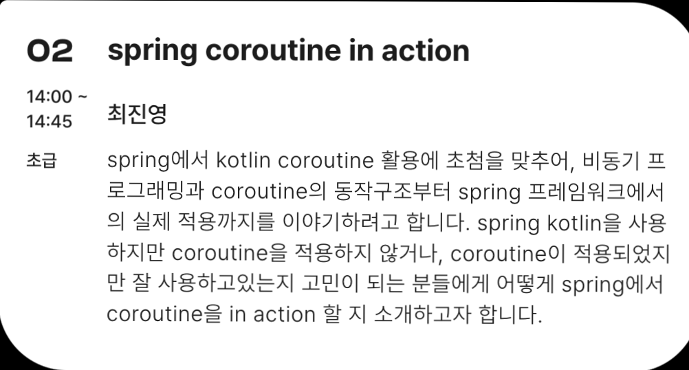 두 번째 세션은 코틀린에서 코루틴이 돌아가는 동작구조와 Spring에서 코루틴을 적용하는 방법에 대해서 설명해 주었는데