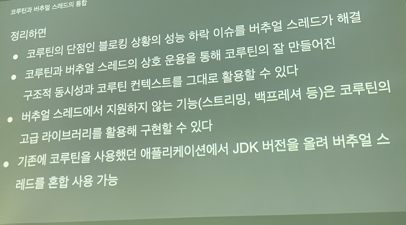 네트워크 블록킹 기간이 나름 큰 LLM서버를 서빙하는 서버를 전제를 가정하여 진행하여 코루틴이 스레드 블로킹 I/O 한 작업 있다면 성능상 분리한 부분을 버츄얼스레드를 같이 활용하면 해결할 수 있다는 것을 알려주셔서 같이 혼용해서 사용하면 좋겠구나!라는 생각이 들었다.