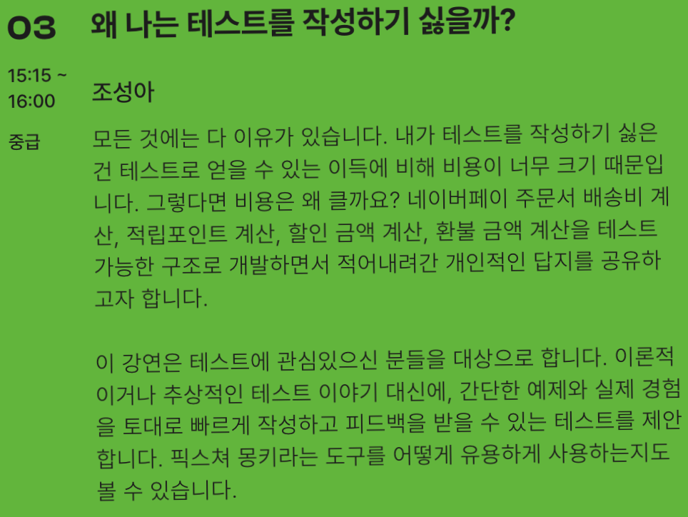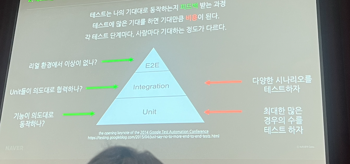 그중 공감이 되었던 게 나도 처음에는 많은 사례를 테스트해야지라는 욕심에 과도하게 여러 테스트케이스를 작성하고 나서 개발 코드작성시간에 대해서 생각해 봤는데 점점 테스트 작성시간이 너무 많아지고 비용이 많아지다 보니 테스트의 본질(테스트를 통한 피드백)을 잊게 되는 경우가 많았는데 다시 불필요한 테스트를 작성하는 게 아닌지?라고 회고 하는 세션이었다.