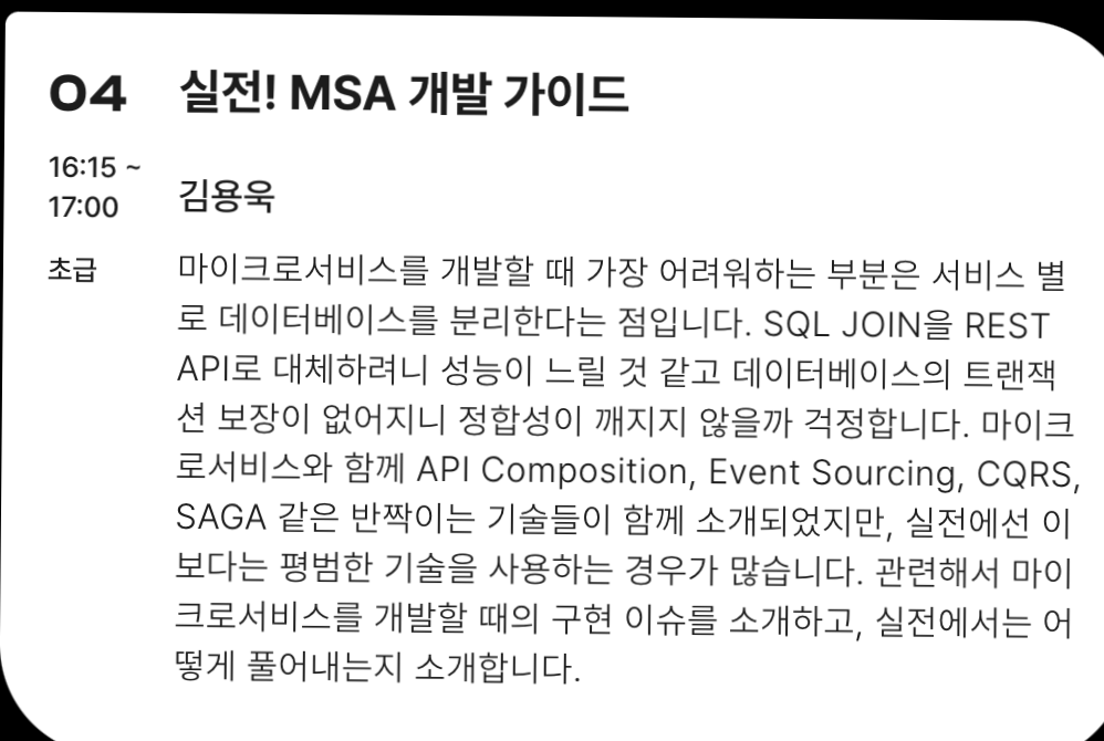 MSA를 개발할 때 풀어야 할 방법들에 대해서 설명을 해주셨던 세션이었다.